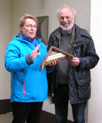 Eins von 20 Insektenhotels, die der Verein „Wir für die Vahr“ verloste, übergab deren Vorsitzende Helmut Weigelt 2019 an die Vorsitzende den Kleingartenverein „Rose am See“, Viola Falkenberg, als die Mitglieder in Gemeinschaftsarbeit die Anlage pflegten. Denn die Pächter der über 80 Parzellen pflegen – zusätzlich zu ihrem eigenen Garten – die gesamte Anlage: Sie schneiden die Rosen, pflegen die Beete, bepflanzen und wässern die Blumenkübel und leeren die Mülleimer. Immer wieder müssen sie dabei auch auf Wegen und in den Hecken Abfälle einsammeln, die Spaziergänger hinterlassen. „Vor allem die Mäher der Rasenflächen beschweren sich sehr über die vielen Hundehaufen, die liegen gelassen werden“, berichtet die Vorsitzende von „Rose am See“ Viola Falkenberg. Da freue es besonders, dass – nach der Sanierung eines Weges 2018 Jahr – , das bei Spaziergängern beliebte Naherholungsgebiet nun für Insekten aufgewertet wird. „Das Hotel wollen wir so anbringen, dass Insekten es optimal nutzen können: wind- und regengeschützt, in Richtung Süd/Süd-Ost, bei freier Einflugschneise“. Der Zeitpunkt sei optimal – auch weil ein Beet mit Rosen gerade zusätzlich mit Schnittlauch, Salbei und Lavendel bepflanzt wurde. Deren lila Blüten sind bei Insekten besonders beliebt. Begehrt sind die 300 bis 400 Quadratmeter großen Gärten auch vermehrt bei jungen Familien. Ein bundesweiter Trend! Der Verein in der Vahr werde jünger und weiblicher, so Falkenberg. Der Altersdurchschnitt sei bei den Mitgliedern nun auf 58 Jahre gesunken, der Anteil der Frauen auf 43 Prozent gestiegen.